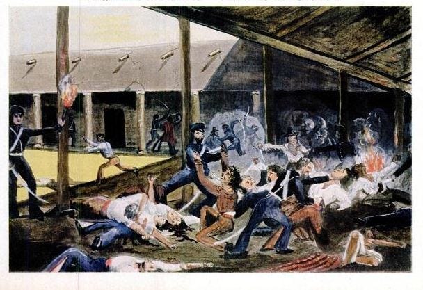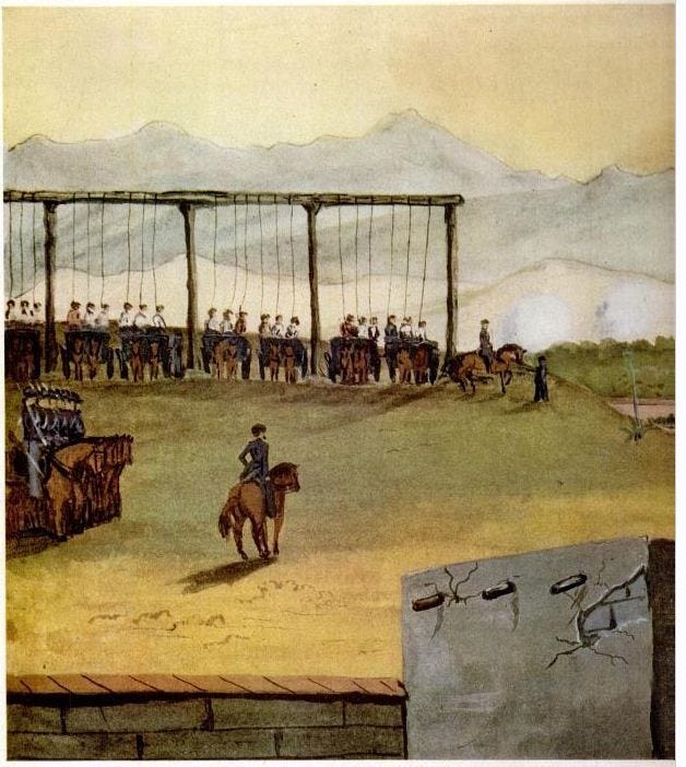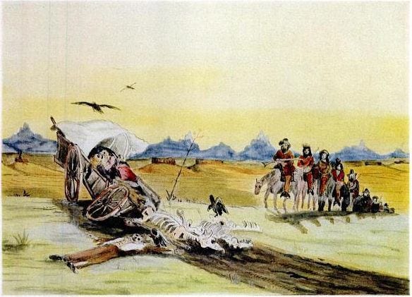 «E un giorno videro un branco di esseri umani dall'aspetto crudele, in groppa a pony indiani non ferrati, cavalcare mezzi ubriachi per le strade, barbuti, barbari, vestiti di pelli di animali cucite insieme con tendini e carichi armi d'ogni genere. Revolver pesantissimi e coltelli da caccia grandi come spadoni e corte doppiette con le canne di un tale calibro che ci si poteva infilare un pollice dentro, e i filamenti dei cavalli ricavati da pelle umana e le briglie di capelli umani decorati con denti umani, e i cavalieri portavano scapolari o collane di orecchie umane essiccate e annerite e i cavalli sembravano selvatici e avevano gli occhi spiritati e i denti scoperti come cani feroci. e tra loro c'erano numerosi selvaggi seminudi che vacillavano sulla sella, luridi, brutali e minacciosi, e l'insieme sembrava un'apparizione da chissà quale paese pagano dove loro e altri come loro si nutrivano di carne umana».