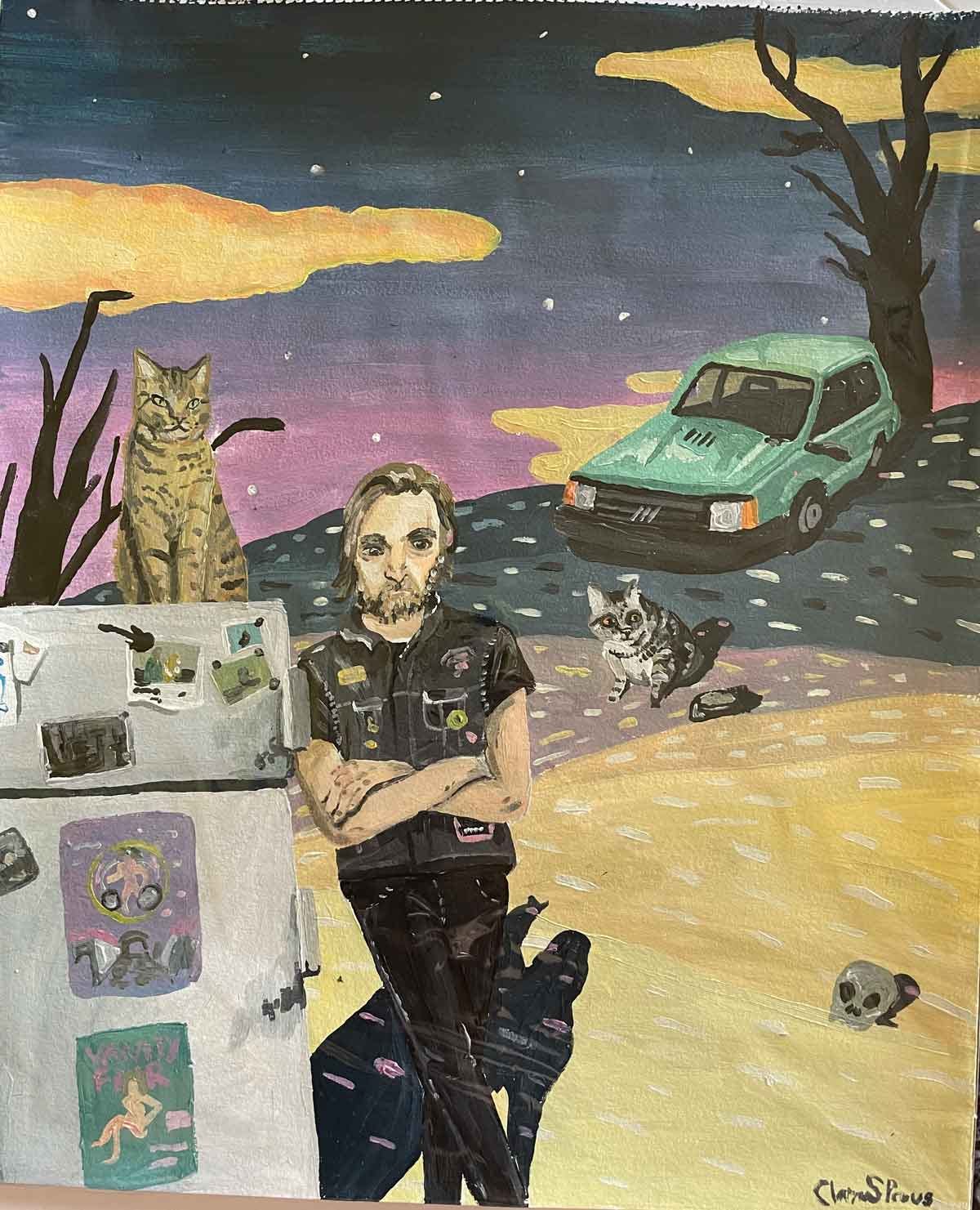 Questo che vedete ritratto è sempre parte del regalo. Siamo: io, Pappeh sul frigo, Willò spaventato che mangia i scrokkietti e il Pandino. Il tutto nel deserto di notte.